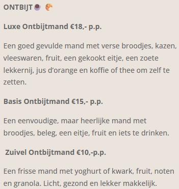 Ontbijt is optioneel en bestaat uit verschillende verse producten. je kunt dit bij je reservering aangeven. Mocht je bepaalde wensen hebben kun je dit altijd in de omschijving achterlaten.
